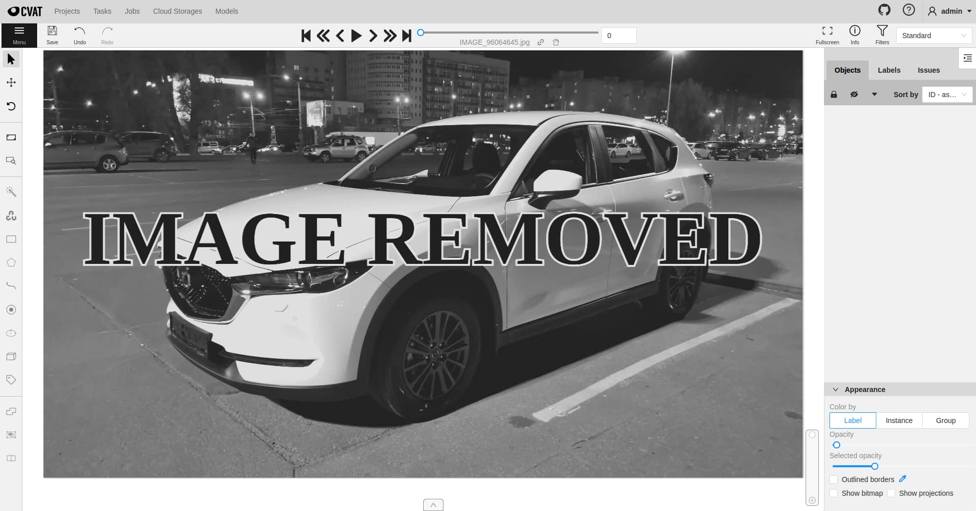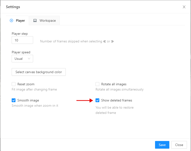 Then you will be able to navigate through deleted frames. But annotation tools will be unavailable. Deleted frames differ in the corresponding overlay.