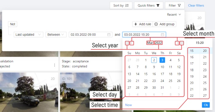 When creating a Last updated rule, you can select the date and time by using the selection window.