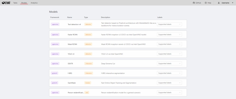 The Models page contains a list of deep learning (DL) models deployed for semi-automatic and automatic annotation. To open the Models page, click the Models button on the navigation bar. The list of models is presented in the form of a table. The parameters indicated for each model are the following: