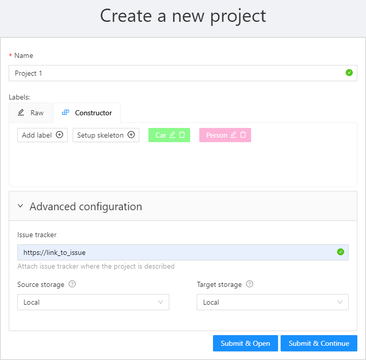 You can change: the name of the project, the list of labels (which will be used for tasks created as parts of this project) and a skeleton if it's necessary. In advanced configuration also you can specify: a link to the issue, source and target storages. Learn more about creating a label list, creating the skeleton and attach cloud storage.