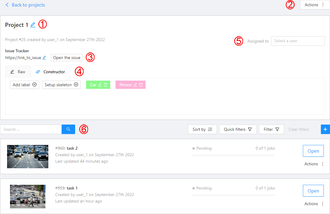 Tasks— is a list of all tasks for a particular project, with the ability to search, sort and filter for tasks in the project. Read more about search. Read more about sorting and filter It is possible to choose a subset for tasks in the project. You can use the available options (Train,Test,Validation) or set your own.